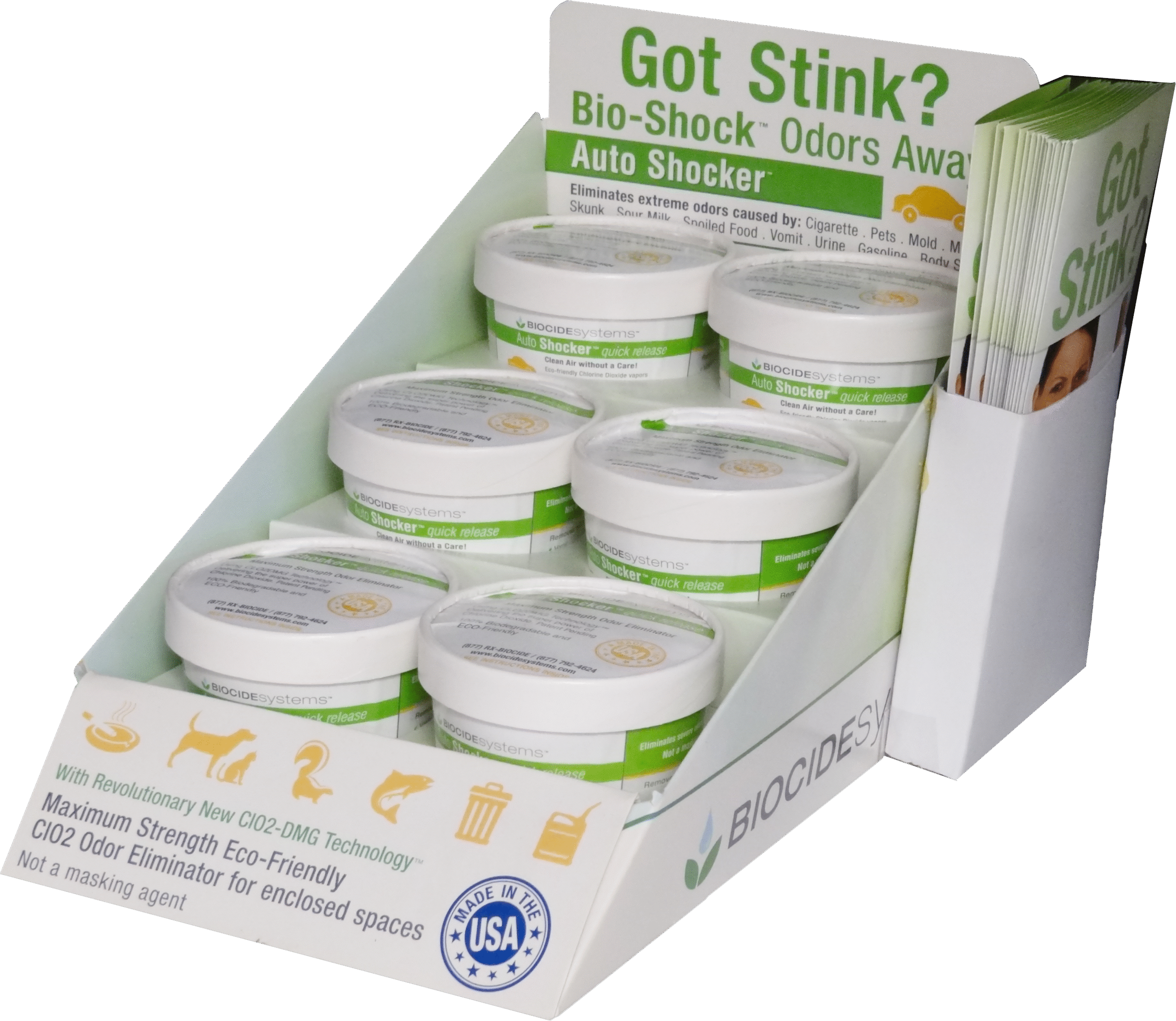Auto SHOCKER Quick Release product is a single-use high-tech packet that delivers the most effective chemical deodorizer (Chlorine Dioxide) safely to neutralize and eliminate even the worst odors in your car. High impulse counter top display.